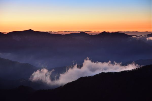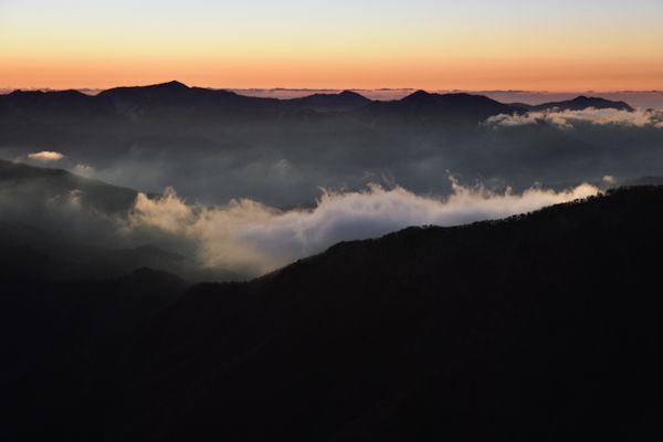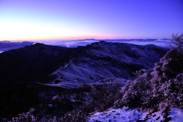 | まずは、m(_ _)m。 17日の予定が急遽18日に変更になりました。 なっちさん、「どーりで土曜日の天気が良いハズ」だと 「くぅ〜〜」 すっぽり空いた土曜日はどーしよう。しかも、16日の地元ニュースでは由布岳が今冬初冠雪だし、翌日の事もあるし・・・ お手頃祖母山にするか・・・、せっかくなら宮原から登って祖母山でご来光を眺めて古祖母まで行ってみようか、等と寝る直前まで野望を抱いていました。 起きる時刻はほぼ予定どおり。でも、NHKのボブディランの再放送、その後、あほなLIFEを見たお陰で、ギリ間に合いそうになくなりました(-_-;) 諦めが悪いので、とりあえず現場で考えることにしましたが、国道57号に着いた時刻で、登山口を尾平から神原に変更! 装備も冬バージョンに切り替え、適当に荷物を放り込んだせいで、いつもより重い。ボッカのつもりは全然無いのに・・・ 担いで歩き始めると、効果テキメンで足が最初から挙がりません(^^;) とはいえ、国観峠までの目標タイムより5分遅れ。 国観峠の手前から、うっすら積雪、寒さも厳しくなって来たので、冬の格好に切り替え山頂を目指しました。 山頂に着いた6時頃、うっすら東の水平線が赤くなり始めた頃、月明かりのせいで殆ど☆は見えません。 雪は積もると言うより、掛かっている位。霧氷は風当たり、陽当たりによって残り方がだいぶ違い、障子岳方面の西側はかなり残る一方、大障子尾根方面は殆ど形跡がありませんでした。 夜明けは、フツーに明け、馬蹄形の南側では雲海が広がり、障子岳か古祖母あたりだと良い景色だったかもしれません。 |