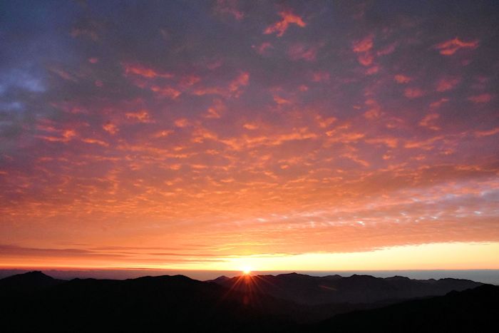 | 月一傾山、なんて思ってたけど先月は2回山頂を踏んだし、まぁいっか~ と登ったのは先週に引き続き祖母山。 三脚の雲台が崩壊したので陽の出直前を目指してのぼろ。祖母山まで先週と同じコースなんでペースメークは体が覚えてます。 ペースは先週より少し遅め。それでも陽の出には十分間に合うけど、縦走路に出て東の空を見ると地平線のうえにうっすらとパープルライン。雲か~ この時点、場所で山頂方面は見えないので、山頂がガスに覆われてるイメージを想像(^^;) 寒い。縦走路に出ると風は強いし寒気のせいで先週より遙かにさみ~ テン場付近になると足元には霧氷のカケラがちらほら。見上げてもそれらしい様子は無く、昨日の霧氷が落下したもの。同日、知り合いの由布岳レポではびっしり霧氷が成長してました(^^) 山頂が見える場所に来ると山頂は見えてそう。東の空はオレンジともパープルとも言えない色に染まり始めた雲。いい感じの予感。山頂に着く頃はミルク色の時間帯。 山頂にはすでに5人くらい待機中でした。その中にぜーぜー息をあげながら到着しさっさと撮影体勢。 移動中のラジオネタ。 講談師 一龍斎貞弥の講談は「秋色桜」 俳句の天才少女の親孝行の話。ともあれ、大分県出身の講談師(^^) 元々、声優さんで他にもバラエティ番組のナレーション、カーナビの声にも参戦してるそう。 引き続きの2時台の特集は「シュガーベイブ」 お~~ 伝説のバンド 山下達郎、大貫妙子、村松邦夫などによるバンド。アルバム「SONGS」持ってるけど後追いで購入したのであまり聞かずじまいだったけど、達郎さん、妙子さんの声が若い♪ さらにさらに3時台は冬の曲特集。ちょいと前に聞いたふきのとうの白い冬。紙風船の冬が来る前に。そして五輪真弓の少女。曲よりも五輪真弓の名前に劇的に反応! 何年、いや何十年ぶりに名前と声を聞いた気がする(^^;) 久々に盛り上がった真夜中の車中でした(^^) 夜明けのショウは素晴らしく、言葉に出来ない。こんな空色めったに見れない。 陽の出直前、直後、何枚シャッターを切ったか分からない。上空に広がる空を見事に染め上げた一時に酔いしれ思いのほか長居をしてしまったけどその価値に十分値する空色でした。 今日は古祖母まで。ミヤマキリシマ公園辺りまでは青空が広がり、このまま今日は良い天気~♪ と思いつつ、祖母山の右側に小さい雲・・・そのまま足を進めもうすぐ障子岳の場所でまさかのガスの襲来(^^;) 振り向くと、祖母山見えん(-_-;) 一時は古祖母も見えないくらいのガスが押し寄せてました。障子岳には30数年前の看板。山頂周辺の木々が枯れ発掘されたんかな~と勝手に想像。平成元年、広島県がキーワードの看板でした。 古祖母山到着。1ヶ月程前、テン泊した際に車のキーを放置事件を思い出し、ついつい行動が慎重になりました。 山頂には2名先客が寛いでいてお茶しながら、くじゅうや祖母山系のお話をさせて頂きました。 古祖母山でノンビリした後は下るだけ~ 冬枯れした森の中は明るく青い空が良く見えます。天気は回復傾向、青空が拡大しつつあるけど祖母山頂周辺だけはガスの中。それ以外は綺麗な青空と白い雲。雲も冬の型。 いつも通りトンネルを抜け県道からショートカットの道を経て林道を抜けさらにショートカットするので、いままで気が付かなかった健男神社。小さい神社だったけど灯籠に刻まれた元号は江戸時代でした。 |