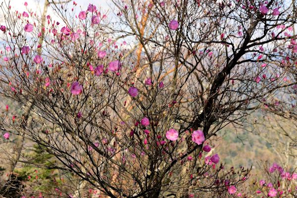 | アケボノツツジの開花状況報告です。 【コース】 七年山北尾根〜七年山〜桑原山〜万治越 【標高】 1,000m〜 ほぼ終了 (5分咲〜満開) 1,100m〜 散り始め (咲き始め〜5分咲き 1,300m〜 3分咲 (ほとんど蕾で開花がパラパラ程度 1,400m(桑原山頂) 咲き始め (蕾) 前日(4月17日)の雨で花が痛んでました。 ※( )は昨年の開花状況 【場所】 七年山尾根の桑原山に取り付く手前まで 桑原山〜万治越前後 話は遡ること1週間前の土曜日の昼過ぎ。そそそろ長崎県大村市で開催される「多良の森トレイル」に参加すべく支度も調い、玄関周りをチョイチョイとほうきで掃わき、ちり取りにゴミを入れようとしゃがんだ瞬間、ぐきっ・・・少し態勢を立て直しかけると更にグキッと・・・。慌てて腰にシップを張りなんとか回復できるか? 実感として回復する確率は、かなり低いけど、とにかく行くだけ行ってみよう。と大村に向けていざ〜 途中、SAで案内を改めて見てると土曜日も受付出来るとあったので、当日の会場でもある野岳公園に向かい、車から降り歩く時点でどう見ても歩き方が変・・・(-_-) なんとか受付を済ませるも、受付の方に「明日、出場できない時は・・・」と確認。 結局、翌朝大会事務局に「出場できない」一報を入れ、事前に行くかも〜と連絡していた長崎隊の皆さんにもライン。帰宅途中に山馬鹿さんから自宅で採れた新タマと長崎名物を手土産にと頂き、美味しく頂いております。ありがとうございました。 ぎっくり腰な1週間がようやく終わりかけ、世はアケボノツツジフィーバー。 これだけは逃したくない、というより追っかけたい花。 今回の開花調査にあたり遡ること1ヶ月ほど前、傾山山頂でニアミス女王様に目出度く拝謁出来た際の話題の一つが県境5山チャレンジ制覇(傾山、新百姓山、夏木山、木山内岳、桑原山)。アケボノツツジの頃は、こっち方面に登る機会が多いので地道にゲットして回ろうなんて考えてたけど、猪突猛進なルート取りをする女王様の前でそんな計画を提案すると一蹴は必至。 傾山でも、「帰りは天狗を経由して尾平に下山したらどう?」のご発言。小心者の自分が「一気五山でいかがでしょうか。できればご一緒に」と口を滑らせたのが運の尽き。「良きに計らえ。必要とあらば迎えに行く」とありがたいお言葉。 このルートの一端でもある七年山から桑原山ルート、アケボノツツジはいつもここから。 今回は、ぎっくり腰の様子見を兼ね、すきなアケボノツツジをのんびり見たいこともあり、先週、さくっと同じルートを利用し木山内まで歩いてた女王様だけど、アケボノツツジはまだ早過ぎたようだったので、お誘いしたところ、ありがたくOKを頂きました。 当日の天気は晴だけど・・・寒気と強風。くじゅうや祖母山は霧氷は確実なSCW予報。森の中に入れば風も止み大丈夫の想定は全然駄目で、ずっと寒風に吹きさらされるという悪天候。 しかも、かおりんさんは寒さに弱いらしい。急登に備え薄着してた自分も汗をかく間もなく冷えていく。「さみ〜」 ガシガシ登るも日向ぼっこ出来る場所を探すという状況。 ようやく温室のようなスペースを確保すると、まずは正常復帰するためは虫類のように太陽を浴び血流促進。落ち着くと腹減った〜と食糧補給。するとかおりんさんが「桜餅〜」 ニアミスを含め3度目の正直でようやく「桜餅」を頂くことができました。 七年山から桑原山に向かう尾根は地図で見ると広い尾根のイメージですが場所によっては急峻な尾根は東西で春と冬が同居状態。東側の日向ぼっこスペースを出るとまさに別世界。再び冬へ。さみ〜 尾根沿いのアケボノツツジは盛期を過ぎ、毎年楽しみにしているアケボノツツジの木も散り始めていました。そして直登ゾーン。 適当にスイッチバックで登らないと、ふくらはぎが伸び伸び状態。今日は、寒さのお陰で地面が凍ってたので歩きやすかったのだけはラッキーで、普通ならフカフカでずるずるな地面だけど、それが回避できたのは良かったです。 山頂はそれほど風は強くないけど1枚着ないとゆっくり出来ない状況。ここでかおりんさんから「後であんこ評論家の意見を聞きたい」と追加の和菓子プレゼンツ。こちらもお菓子を渡し軽量化したけど、頂いた重量からすると重くなった、かも。 万治越に向けて歩き出すとやっぱ寒い。強風にあおられるアケボノツツジをカメラに収めながら下っていくと万治越直前で祝子方面から登ってきたグループに遭遇。リーダーらしい方と話してると、かおりんさんが自分を指さして「今日は夏木山までいくらしいですよ」「(なに!?)、あなたも一緒です」 結局、この日は万治越まで。ここも少しは風が止むかな〜と思ったら、全然寒くて結局、風が避けられる岩の上でしばらく日向ぼっこ。寒さのお陰でゆったりと時間が流れた一日でした。かおりんさんは、先週と同じでしかも短いルートで不完全燃焼だったと思いますがおつきあい頂きありがとうございました。 |