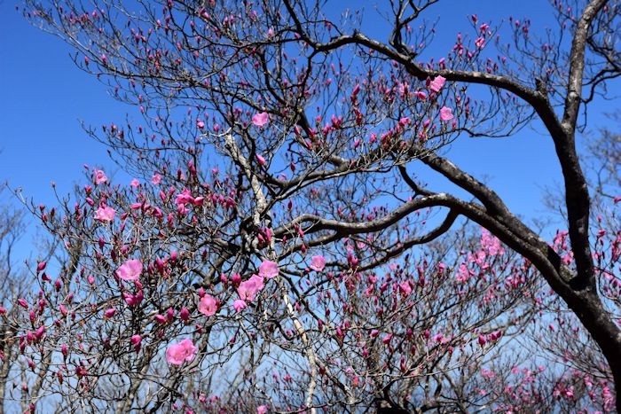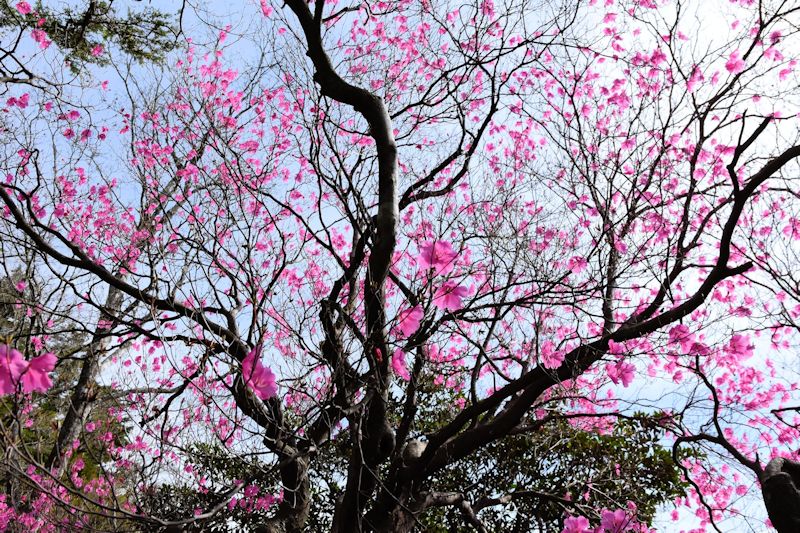 色合い、花びらをまとった枝々を見上げて出るのはため息ばかり。まるで、満開の桜に負けじと咲き誇る姿、濃いピンクといい他のアケボノツツジを圧倒する立ち姿である。
