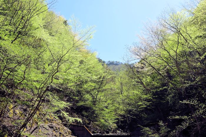新緑眩しい林道におり着くと、後はひたすら歩くのみ。途中の滝壺が見えると、かおりんさんはあちこちから覗き込みながら、綿密にドボン計画を練り練りし、きどっちに本日は置いてきたザイル、こんな時に使わんと〜 (^_^;)