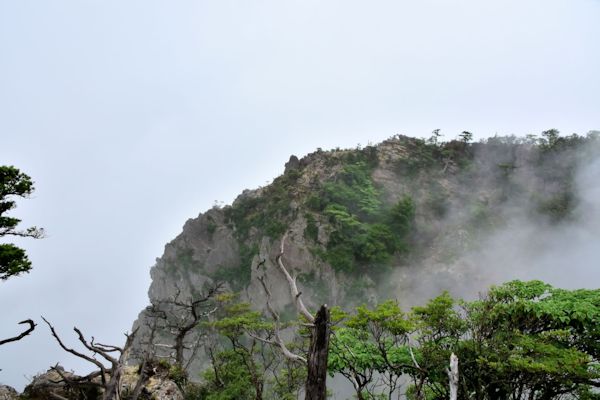 でも天気予報どおりのガスな天気で猫耳は見えず、後傾に着く頃、谷から吹き上げる風でガスが飛ばされ、一瞬、足下の谷や三つ坊主が見えました。