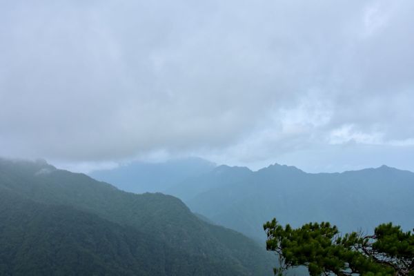 次第に天気は回復傾向の兆しもあり時折青い空も見え、祖母山頂付近まガスが上がり、窓から見える大障子を撮りながら久々の登山道をかみしめながら下る。ただ、途中で倒木もあり、小さい枝は鋸で切ったけど、さすがに大物はどこを通るかしばし考えるばかりでした。