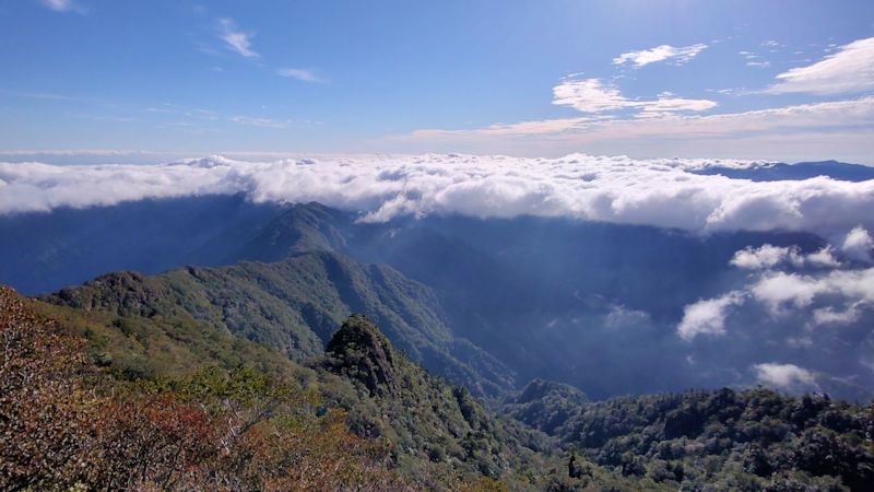 | 先週に引き続き祖母山W。今回は、尾平を起点にして尾平越から古祖母経由の祖母山からの国観峠経由北谷登山口からの風穴コースから2回目の祖母山からの宮原経由にしてみました。前回より、距離、累積標高も増えてるけど前回の感じからだと行けるけど、3回目の登りはヒーコラなんやろな〜 上記は、先週(9/18)の冒頭」を活用してみました 「先週に引き続き祖母山W。今回は、尾平を起点にして黒金尾根経由祖母山からの国観峠経由北谷登山口からの風穴コースから2回目の祖母山からの宮原経由にしてみました。前回より、距離、累積標高も増えてるけど前回の感じからだと行けるけど、2回目の登りはヒーコラなんやろな〜」 祖母山Wシリーズ3回目(いつシリーズになった!?)。 最初はWのつもりはなくて、尾平から古祖母、障子岳から黒岳経由北谷に下ろうかな〜、と思ったけどフツーっぽくて、今の体力と翌日は業務で外で農作業だったので控えめに、とかなんとか・・・場合によっては北谷下らず祖母山シングルにしようか、とか。 設定したコースは冒頭のとおりです。尾平に着くと車は1台。一方で北谷は車で溢れかえってました。 4時にスタートし真夜中の県道7号をマイペースで登っていきます。尾平トンネルでは追い風が気持ち良く感じられて、こりゃ今日は天気予報どおりじゃ〜 と尾平越に着くと右側からの強風でしかもガス。寒いんですけど・・・視界も10m程度だし(-_-) ガスの雨粒が降り濡れたせいでフィンガレスの指先はジンジンするし、それでも背後の空はガス越しに明るくなり夜の帳が開けつつあることがわかる。それより寒いぞ! 高森町の最低気温が17.0℃。ということは山の上は10℃前後でしかも風があるので、その中でランニングに半パンは過酷な状況で、「還暦過ぎの無謀な登山計画、低体温症で遭難」なんて見出しが思いつかない事も無い。コメント欄も炎上気味の内容で溢れそう・・・ なんのためのカッパや防水手袋なんや、と古祖母山頂でとにかく防寒対策していると高千穂方面が晴れたりするもんだから大忙しである。まずは嫁さんをザックの中から引っ張り出してガスが晴れつつある高千穂方面を見せる。寒いやろ〜 何枚か写真を撮っておにぎり頬張って障子岳へ。 忘れてたけどとっくの昔に靴の中は水没(-_-) 靴はゴアではないので次第に乾くので気にしない。 障子岳に着くとガスの全貌を確認。大障子岩と古祖母を結ぶ線より東側で雲海が発生し、本谷山や猫耳傾山がちょこっと耳を出している。この日、傾山に居た方はきっとカンドーしたやろなあ。その向こうの大崩山系はピーカンみたいな状況でした。 ここから先、景色は明瞭で祖母山Wシリーズの中では最高の天気と景色です。 1回目の祖母山は山頂到着時刻の端境期みたいで、今回も着いて間もなく1人登ってきただけでした。ゆっくり嫁さんに景気を見せました。今日の雲海は朝駆けで見たかった、そんな雲海でした。 ここまで来て、まだ足ありそうだし、明日の外仕事は成り行き任せ的な気分で北谷へ下山開始〜 3回目となるとルート、ペースも概ね掴めてるので気持ちで焦ることはない。しかも、天気は良いし、空気もサッパリして秋の気配を感じさせる。北谷は路上駐車するほどの賑わいである。自分が着いた頃にも1台到着し路上駐車追加してました。 祖母山への登り返し。前回より足は死んでるような気もするけど最後の登り、極力休まないようゆっくりだけどヒーハー言いながら小刻みに足を進める。今日は涼しい。 3週連続の風穴コース。いつもの展望台に立ち寄る。この時間帯の祖母山頂はとても賑やかで嫁さんと話づらいので、ここは景色も違うし休憩も兼ねて都合の良い場所である。繰り返しになるけど今日は良い景色である。 ここから山頂まで標高差で100m。ダッシュなんて出来ない。止まらないだけ。北谷で見た車の台数からしても賑やかな山頂である。トレラン姿は自分だけで間違い無く浮いた存在になっている。小さな声で嫁さんと話しながら、他の皆さんの記念写真の合間を縫うようにして雲海を背景に記念写真を撮り、2回目の山頂をそそくさと後にしました。 祖母山頂でGPSの距離を確認すると予想より距離伸びてる。トレーニングとしては悪くないが明日の外仕事に差し支えるかも。年寄りだから許してもらおう(^_^;) 下山途中は祖母山を振り返りながら祖母山を見上げ、フラットな場所ではまだまだ足は動いてる。 川の音が聞こえてくると後はドボンだけ〜 毎回思うけどドボン効果は素晴らしい。ドボンの後は汗臭さは無くなり、脱いだ服も袋の中につっこんで家に帰ってだしても臭わず消臭効果半端ない(笑)。 体を冷やした後は駐車場まで最後の祖母山を嫁さんと見上げながら本日の祖母山Wシリーズ第3弾を終了しました。 帰宅後は大相撲観戦。 前回のコメントは、「主役不在の今場所、誰もが優勝を狙える状況。面白くもあるが番付の意味が良く分からなくもあるこの頃の大相撲。頑張れ高安、頑