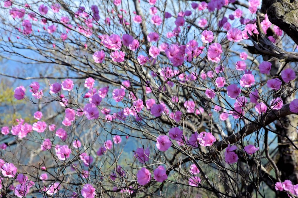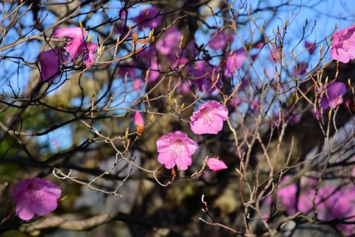 | 【アケボノツツジの場所】 七年山尾根の桑原山に取り付く手前までと桑原山〜万治越前後 【概要】 ザックリ言うと、見頃だったのは七年山尾根の1,100m以上、桑原山手前1,300m〜桑原山山頂まで。 桑原山山頂から万治越えまでの間も蕾も多かったけど良く咲いていました。 恒例になっている春のアケボノ鑑賞ルート。昨年は同じ日の七年山尾根だと既に終わり、桑原山頂がメインだったかもしれないけど、今年の開花は遅れてそう。 昨年、4月20日に歩いた時は楽しみにしていた桜のようなアケボノツツジは散り始めて、下から見上げるとスカスカだった。少し前に歩いたきどっちは見落としたらしい。 なし見落とした? と言いたくなったけど開花が遅れたせいかもしれない。今回は下り坂の途中から見えたアケボノツツジはこれまで見た中でも1,2位を争うくらいの咲きぶりで色も濃い印象。 今日はは平日。前日の雨はあがり天気予報は朝から晴れなので、この時期にしては空気が澄むかも〜 アケボノツツジは先日の奥天上と同様、咲いてるのが見られればラッキーと思ってました。 株元にたどり着き見上げると息が止まるほどの艶やかさ。しばらく嫁さんと花見タイム。素晴らしいの一言だけど写真に撮るのが難しい・・・来年も来れるかな。後ろ髪をひかれながら好きな巨木ゾーンを振り向きながら通過すると、桑原山山頂への直登。 七年山尾根を振り返ると空気の透明度が高いこともあり1,161mピーク周辺のアケボノツツジのピンクが目に付き花見してたアケボノ桜も良く見え、遠くには由布岳がくっきり。山のラインがこんなに明瞭だったことも少ない。 木々の高さが低くなる1,300m辺りから再びアケボノツツジが現れ、5〜6分咲きといっても日当たり、個体差もあります。 万治越へ。途中のアケボノツツジは山頂より咲いてるけど、蕾も目立つ印象です。それより気になったのは馬酔木がモリモリしていて歩きにくくなった箇所が点々とあること。覚えてたら次回は武器持参で登ろ。 万治越のブナにあいさつしてから少し木山内岳方面に歩いた場所のアケボノツツジが綺麗だったな〜と。想定の咲き具合だったけど風が止まらず花が揺れっぱなしで止まってくれ〜 と待ったけどその気配はなく、数打ちゃ当たる方式で対応。 今日は腹いっぱいのアケボノツツジ、ごちそうさまでした。(2025.4.25) |