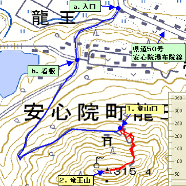 ![]() (3) 地図「b.看板」 龍王城の看板があります。この先100m付近を左折します |