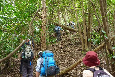 | ゴールデンウィークが近くなったし、遠くの山は混雑が予想されるし久しく歩いていないので、登ってみようかなぁ、と思っていた所、某グループから案内をして欲しい、とのメールを頂きちょうど良かったかなぁ、と思い同行させて頂くことにしました。最初に、このコースをつないで歩いたのが2007年1月、再踏査で同年4月だったので4年振りとなりました。 自分としては「宇佐6山」として紹介してきましたが、石井山と高山の間にある小さいピークも入れて「宇佐7山」と呼ばれることも多くなったので、今回は「7山」扱いとしました。 4年振りとはいえ、それぞれの山も単独で何度か登っているので、概ねイメージはあるのですが、最初に歩いた頃に比べるとコースも落ち着いた印象を受け、危ない場所はトラロープが整備されておりました。また、今回のグループの中には昨年も参加された方がいて、昨年よりコースが整備されていたそうです。 いずれにしても、こうやって毎年参加してくれる方がいるとは、このコースの紹介に関わった者としてうれしく思いました。 さて、今回のメンバーは自分を含め16名、40代半ば〜70代後半で基本60歳以上の方が多く、最初は正直大丈夫かなぁ、と感じ事前の打ち合わせでリーダーさんに聞くと、ゆっくり歩くので結構歩けますよ〜、との回答。実際の計画も昨年の実績をもとに8時間をかけて歩くように設定されているので、そうかも、と納得しながら歩き始めました。その前にストレッチ。 いざ、歩き始めるとなかなかどうして、登りではほとんど隊列を乱したり、遅れる方もなくさすがかなぁ、と感じた次第です。ただ、どうしても急な下りが多いのでロープのある場所では大人数ゆえに時間がかかってしまいますが、それ以外は皆さん元気に7山歩き通すことができました。一方で疲れたような発言をされる方も無く、それぞれが7山を楽しまれていたように感じました。 自分も案内といっても、コースが整備されているのでさほど出番もない、と思い写真係と水の運び屋とGPS記録係に徹することにしました。御陰様で、後半水の売れ行きも良く、4リットルの水はすべて完売、自分の荷物もずいぶんと軽くなりました。 今回、歩いていて綺麗だったのは、鬼落山から石井山に向かう途中の山桜です。すでに散り始めてはいましたが、思わず皆さんから歓声が上がりました。最後尾にいる自分は何が起こったから解らなかったのですが、その景色が見えた瞬間「おーっ」と感動の一声。その他にもハルリンドウや数種類のスミレが足元を賑わしていました。 来年は石井山の花見を是非果たしたいと感じた山行でした。 また、はるばる宇佐の低山縦走路を楽しんで頂いた皆様に、この場を借りて御礼申し上げます。(2011.4.17) 【今回の踏査結果】 ・「妙見山登山口」から登り「高山登山口」まで歩きました。 地図はこちら ・全線登山道は目印が以前より充実しているので迷うことは無いと思います。 ・ビニルのトラロープを握ることが多いので滑り止めの付いた手袋持参をお勧めです。 ・低山と言え結構ハードなコースなので、エスケープを考慮した計画をお勧めします。 ・人数、昼食、休憩等を考えると8時間程度を見ておきましょう。 ※今回は山頂で5〜10分、昼食で20分の休憩で約9時間かかりました。 ・水はこの時期2L程度は必要です。 ・個人的な感想としては尾平から祖母山に登るのと同じかそれ以上の疲労感です。 ・登った高さ 1200m、 歩いた距離 10.5km(前回のデータも参考)、 詳細は下の別表を参考にしてください。 |
