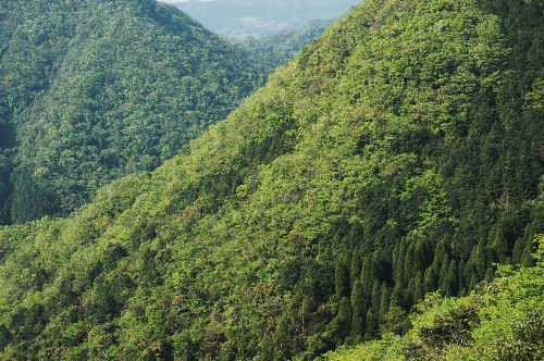 | それは1通のメールから始まりました。宇佐市内の方がボランテイァで地元の山を整備しており、HPを見ている内に、当HPを見たので整備している登山コースを紹介して欲しいという内容でした。どのような内容で掲載するかメールをやりとりしているうちに、個人的に心の中に火が着きました。 この妙見山から高山の縦走に関しては以前から構想がありましたが、「これは、行けると」感じたのは、昨年、高山のきちんとした登山道を見つけてからです。問題は石井山から高山の途中でしたが、メールの中でこのあたりも整備しているとのことだったので、縦走できることを確信しました。 今回の報告にあたりHP用に再度写真を撮ろうと思っていましたが、ちょうどデジカメが風邪を引いてしまったので、修理が終わってからと考えていましたが、携帯のデジカメも200万画素あるので、これでもいけるかぁ、と思い携帯にSDカードを入れて今回の山行に臨みました。 しかし、そこは携帯のデジカメ。いつも持っているような広角が得られないので、思ったような画像というか雰囲気が出ませんでした。また、天気予報は晴れだったのにも関わらず、結局、雨が降らなかったものの、ずーっと曇りでした。 ただ、空気の透明度は良かったのか、久住まで見えました。 さて、本題ですが、数年ぶりに歩くコースも多かったのですが、香下ダムのバックウオーター付近の登山口から登り、まずは妙見山に登り高山までの縦走路を歩く、結構長丁場です。全行程は距離で約10kmですが、アップダウンが大きくGPSによる累積標高差は1450m、過去の実績による補正係数をかけても1200mを越えるものとなりました。 全体の感想として、それぞれ単独の山としても十分個性がある山であるのに、これが一気に縦走できることもあり、なかなか歩き応えのあるコースです。しかも、いつも大量の人が登っている山ではないので、立派な登山道ではありませんが、歩くには支障がなく、なおかつ野性味溢れ、藪こぎちっくで申し分ない内容であります。 縦走とは言え、登っては急降下し、急降下しては里山特有の急斜面を直登の繰り返しで結構体に応えます。特に、ロープや立木に掴まって歩くため、翌日は足は当然のこと、肩や腕が今までに無いくらい凝っています。 【再踏査 2007.4.28】 前回、天気が今一つでカメラも故障していたこともあり、以前から天気が良くなったっ時に登ろうと思いつつ、他の方についつい触手が出てしまい、ようやくこの時期になってからの再踏査となりました。コースは前回と同様で妙見山から高山を目指しました。特に理由はありませんが、最後に高山の山頂でのんびりしたいからです。高山は森林環境税を活用して看板などが整備され、山頂も一部木が切られ見晴らしが良くなっています。お勧めは細長い山頂の北端です。今回も山頂でおにぎりとフルーツ缶詰を食べ、一人で悦に入っていました。GWなのでひょっとしたら誰か登っているかなぁ、と思いましたが、本日は一人きりでした。しかし、石井山の急斜面を下っている時、足元から突然ウリ坊よりも大きいイノシシの子ども6頭(多分)が一斉に走り出し、ちょっとびっくりしました 踏査結果は前回とほぼ同じ距離、累積標高差、時間でした。ただ、気温も前回より高いということもあり、スポーツドリンク3本(500ml)を飲み干しました。今からの時期、暑くなるので本来里山のシーズンとは言えませんが、水場がない本コースを縦走する際は最低でも水を2リットルは準備しておいた方が無難のようです。それと、前回と同じですが鬼落山下り辺りになると親指の付け根にマメが出来そうになります。何故?としばし考えましたが、鬼落山への登りが急登のため、つま先立ち状態で登るためのようです。 里山特有の直登、直下のアップダウンなのでこれを楽しむつもりで歩かないと苦しいだけの縦走になります。また、本コースは樹林帯の下を歩く時間が長いのですが、祖母傾に慣れてくると、これはこれで気持ちよく感じるとともに時折景色の良いばしょでは感動が新たになります。 【2回の踏査結果の要約】 ・下記地図の「妙見山登山口」から登り「高山登山口」まで歩きました。 ・登山道は目印が有るので迷うことは無いと思います。ただし、石井山から高山の間は少し分かりにくいので、 迷ったと思ったら目印のビニルテープを探して下さい。 ・ビニルのトラロープを握ることが多いので滑り止めの付いた手袋がお勧めです。 ・低山と言え結構ハードなコースなので、エスケープを考慮した計画をお勧めします。 ・あまり休憩なしで6時間以上かかったので、人数、昼食、休憩等を考えると8時間程度を見ておきましょう。 ・個人的な感想としては尾平から祖母山に登るのと同じかそれ以上の疲労感です。 ・登った高さ 1200〜1300m、 歩いた距離 10.5km(前回のデータも参考)、 詳細は別表を参考にしてください。 ※最近は高尾山支城跡のピークを加え、「宇佐7山」とも
