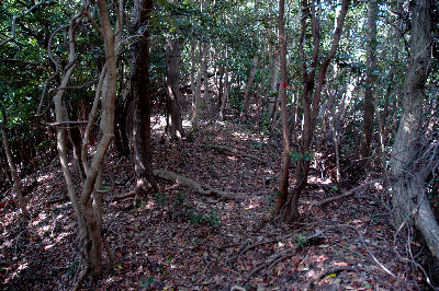(7) 谷山への縦走路。射場越えからすぐは少し分かりにくいですが、 少し奥へ行くと左が自然林、右が杉の植林地帯です。 |