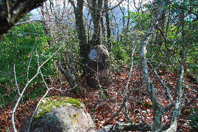 (5) 山頂の東側には人工的な岩が立っていて、落書きらしい文字が刻まれています。 |