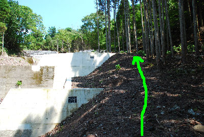 ![]() (4) 次に、元の岸に戻ります。元の岸にはゲートがあり、一度道まで戻ります。堰堤の上に→で指しているパイプが見えると間もなくです。丸印あたりに登山口となる杉が見えるはずです。 |