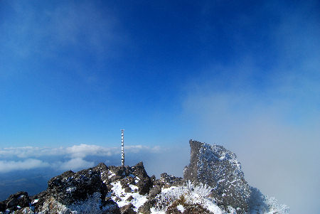 | 今冬初の寒波到来の知らせ、恐らく、由布岳やくじゅうでは雪のはず。ご来光&初雪を楽しむべく、何処に登ろうと迷ったまま布団に潜り込んだのが失敗のもと。目覚ましが鳴り、うーん、どっちにしよう、と考えている内に寝てしまい、再度、目覚ましが鳴っても同じ。結局、目が覚めたのは6時過ぎでした。 できれば三俣山、と考えていましたが途中で見かけた由布岳の北側斜面はしっかり白く、予想外の雪の多さとアイゼン持ってね〜、と。こーなれば、登れそうなところまで登って、無理だったら引き返そう、との判断のもと東登山口から由布岳に登ることにしました。 朝7時過ぎから登り始めましたが、登山口付近から積雪があり多いところでは10cm前後、吹きだまりではそれ以上です。また、上の鎖場付近やその上の日陰の場所では結構な雪がありました。お鉢巡りルートに出ると、西側斜面を中心に霧氷で真っ白です。アイゼンがあればお鉢を歩こうかなぁ、と思いましたが今回はパスです。 東峰山頂に10時過ぎに到着、そのころからガスが取れ始め綺麗な青空と雲と雪が眩しく、山麓は終盤に近い紅葉が白い雪の上に舞い落ちて、綺麗でございました。 |