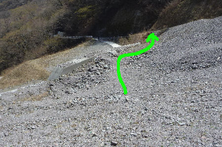 ![]() (19) 船底。矢印の方向が林道に降ります。踏み跡、テープなど目印は多く付けられています。また、最も急勾配の箇所にはロープが設置されていました。 |