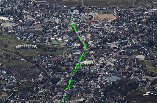 ![]() (22) 緑の点線が湯布院の街の中の経路です。 |
