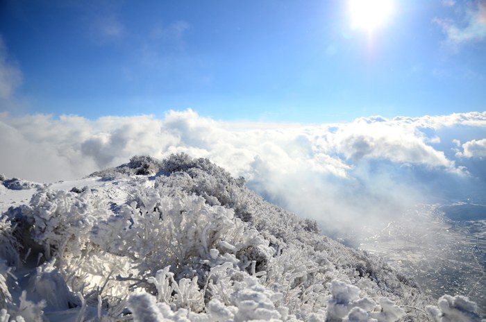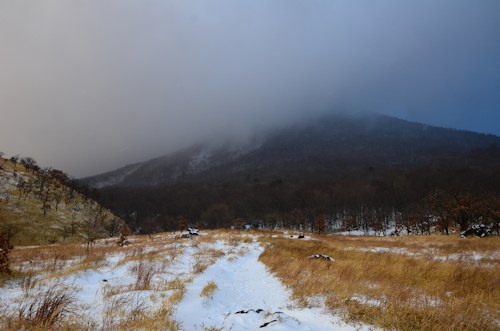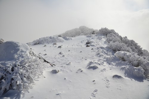 | 明日は雪の祖母山に登るぜ〜、の心意気で床についたのですが、夜中に訃報が入り翌日は待機状態と判断した時点でビールを駆けつけ一杯の勢いで飲んで再び布団に潜り込みました。翌日、予定が正式に分かったのでそれならばこの雪の中山に登らない手はないと、近くで雪を楽しめるとなると由布岳でしょ、とそそくさとキャンピング仕様のザック+冬山仕様(アイゼン+厚手のグローブ)で昼前から出かけました。 アフリカンサファリ付近から路面に雪が積もり始め、塚原高原の県道にはたっぷり雪が降り積もりノーマルタイヤの車の走行が次第に困難となりつつあります。途中から前に普通より大きめのレッカー車らしいのが2台走っていて、雪の時期最も難所となる由布岳東登山口方面に登っていきます。しばらくすると某飲料メーカーの赤い車を挟むようにレッカーが止まったのでこれのレスキューに来たようです。 それにしても昼前にこの辺りを通過しましたが、かなり雪が降り積もり、正面登山口に着いた時は降りしきる雪の中、朝から登っていた方々がちょうど下山してきたところでした。今冬1番の寒波、人は少ないかな〜、と思っていましたが結構駐車していたのと、大型バスが2台。この天気にしてはまずまずの人出です。 雪が降る中最初からカッパを着て12時30分頃出発。正面登山口にしては雪が積もり、思ったより人出が多く登山道は圧雪状態で足下がスリップします。なんとか後半まで持ちこたえて歩きましたが、マタエ直前で少し渋滞が発生していたので、ここでアイゼンを装着しました。ところで、途中から登る方々に追いつき始めましたが、ザックにハングルのタグが付いていて、韓国からのツアー客のようで、ばらけて登っていましたが30名ほどは登っていたようです。 西峰山頂には14時半頃着、山頂付近はガスに覆われていましたが、なんとなく明るくなったり青くなったり。すると短時間ですが西峰周辺のガスが取れ誰もいない西峰山頂で一人ではしゃいでいました。再びガスがかかり始め短いながらも陽射しのある西峰を後にしました。途中はガスに覆われていましたが、合野越付近になると夕日が再び林の中に差し込み始めそろそろ日の入り時間が近づきつつあります。 振り向くとしっかりガスに覆われた由布岳を見上げながら、そーいえば今日は何歩歩いたかな〜、と思って万歩計を見ると15,000歩ほど。登山ってあんまり歩数が伸びないことは分かっていましたが・・・帰宅後、散歩で歩数を稼ぎ本日のノルマを達成しました。 |