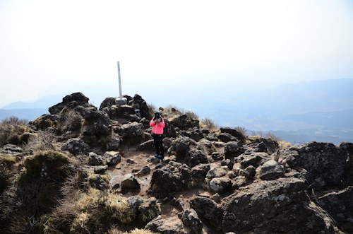 (3)残念ながら景色は今ひとつ、これに野焼きの煙も加わりました。 ![]() (4)山頂よりお鉢を回る方を撮影してみました。 |