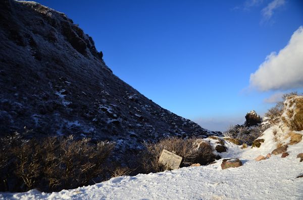 | 新年明けましておめでとうございます。本年も皆様方のご訪問をお待ちしております。 元旦はなかなか山に登る時間取りが難しかったのですが、昨年、100回目を機会に365日別に整理してみると、ミヤマキリシマ、アケボノツツジ、紅葉の時期に加え年末年始は大掃除、餅つきなど、どうしても難しい時期であるように思い、今年は年末から嫁さんに「1日は山に登る」と宣言しておきました。 といっても、大晦日は日本人らしく「紅白歌合戦」を最初から最後まで堪能、特に、泉谷しげるが民放で「NHKに後悔させてやる。今回が最初で最後だ」と息巻いていたので、ちょっと期待しましたが、偽ゴールデンボンバーには負けた・・・? 寝たのは1時前、翌朝は9時頃起床しニューイヤー駅伝を観戦しながら雑煮を食べ、12時頃からぼちぼち出発です。 登山口を13時過ぎから歩き始めました。出発時間も遅かったのか駐車スペースに困ることもありませんでした。ただ、空はなんとなくドンヨリしていますが、そこは元旦に登れるということでご愛敬といったところです。雪の状況は思った以上に残っていて、合野越手前から圧雪状態の雪道となりました。登りは急登が始まるまではアイゼン無しで、急登が始まったところでアイゼンを装着しました。 踏み固めていない場所で図ってみると積雪は30〜40cm位あったようで、そのお陰で年末の祖母山と同様、舗装状態で岩や石を気にすること無く歩けるので楽ちんでした。 山頂に着いた頃は天気がイマイチで、さっさと下ろうかと思いましたが、1時間ほど待機して下ることにしました。天候が次第に回復し山頂で夕日を観たかったのですが、予備のヘッドランプは持参しているものの、ヘッドランプを忘れたためギリギリの判断です。 しばらくは天気が冴えない間は今年初のキャラメルマキアートと丸ボーロで体を温めながら待機です。 山頂に着いた頃は天気が今ひとつ、PM2.5? と思う様な霞んだ景色から次第にガスが晴れたこともあり、青空がとても綺麗に感じ、こんなに青空は綺麗だったんだ〜、と一人で感激、大騒ぎしていました。 もう少し、もう少しと思いながらゆっくり下りながら止まっては写真を取り、写真を撮っては歩くの繰り返しです。途中からは小走りで下り、草原地帯に丁度5時頃到達です。 その少し前の樹林帯の木々の合間から山頂が夕日に染まる様子が見えていたので、スピードアップして下りましたが、一番良い時間帯から少し遅れた感じです。それでも山頂が紅く染まり、本年最初の山行を楽しむことができました。 |