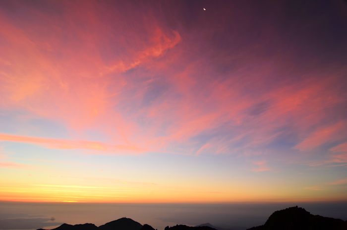 | 今週末は何かと所用があり、山に登ることが出来るのは日曜日の午前中に限定され、恒例由布岳です。なんだか、今さらながら今年は由布岳詣でが増えそうな予感。 金曜日に毎時の天気予報を確認すると、憎たらしいほど日曜日の午前中に曇りマークです。でも、ここしか時間ないし・・・雨は降らなさそうでも、恒例、ガスの撃沈か〜、と。でも行かねばならぬ、行かねば〜ならぬ〜・・・なーんて(^^;) 真夜中、家の前で三日月を見上げると、ガスの影響? ちょっとボンヤリ見えるのは気のせいかなぁ・・・ 正面登山口に着くと、由布岳も朝駆けラッシュで、到着した頃には既に歩き始めた方もいらっしゃいました。 自分も、登山口に着くまでは、のんびりモードで、なんて考えていても先行者がいたりすると、妙なスイッチがonして、前回以上にガスガスもといガツガツ登り、途中数人を抜いてマタエに着くと、ここで撮影待機している方がいたので軽く、挨拶してそのまま西峰突入! 山頂には4時10分頃到着すると、思った以上にガスは無く東側の天気は概ね良好で、オリオン座も祖母山で見たより、はるかに綺麗に見えます。 後は、このまま普通のご来光で良いから、ガスらない様に祈るばかりです。夜明け前は天気が良くても、良い頃合いになるとガスで見えなくなる、ありがちな撃沈パターンだけはなんとか避けたい・・・ お陰で、ご来光までなんとか耐え、まずまずの朝駆けの内容となりました。そろそろ下山しかけた頃、由布岳の影を見ると、影に帽子のツバがあり ? ガスか? と、思った矢先、一気にガスが押し寄せ、今回のトップの画面の様な絵柄となった次第です。このガス、結構良かった〜 あまり、のんびりも出来ないため、花を撮影しながらマタエに着くと、なんと、まだオダマキ様が咲いておりました。 マタエから下は、軽くjogする感じで下っていくと、半袖、半パン姿のため、トレランのトレーニングと思われる冷たい視線を時折感じます。 この時期なんで、自分としては恒例の格好なんですが。一方で「涼しそう〜」と、言う声も耳にして、いや〜、是非お勧めですよ〜、と言いたかったです。きっと、病みつきになるはず、半パン生足 (^^) |