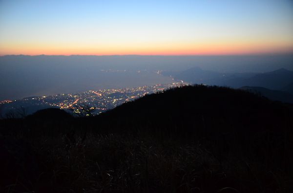 ![]() (5)振り向くと日の出。ここで直さん提供の抹茶しるこで暖まりました。 |
