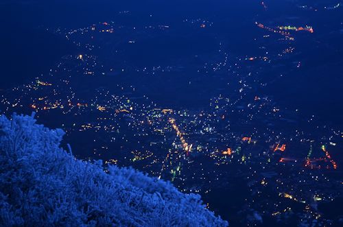 | マラソン中継を見る方ならご存知の言葉、「30kmの壁」。フルマラソンでは避けて通れない壁でありまして、フルに参加する場合は、2、3度は走っておくのが必定。 解ってますが、山だ、トレランだ、となかなか走ることが出来ず、取りあえず先週のトレランもその一環。 土曜日は午後から雨が上がる予報なので、地道に30kmを走ることにし、山方面に向かい、山が近くなると霧雨が降り始め、下ってくると次第に気温が下がり始めました。 そのせいか、25km過ぎたところで足が死んでしまい、途中歩きも入れてなんとか28kmまで行きましたが30kmまで到着しませんでした(-_-;) 本番、大丈夫なんやろか・・・ 問題は、そのあと。シャワーを浴びるも体が冷え切ったようで、腹の具合は悪くなるし、ホットカーペットの上で毛布かぶって寝ても体は暖まらず、ゲロゲロ状態で夕食をまともに食べる気も起きませんでした。 そんな、翌日の天気は晴れで、しかも山は雪の予感。雪が少ない今冬、これを逃す訳にはいかん。 問題は、朝それとも夕方? 足大丈夫? 夕駆けにしようかな〜 でも、やっぱ、朝駆けよね〜 と、家を出る2時過ぎの天気は雨 (-_-;) マジ雨男。 登山口に向かう途中、一度は、月が見えたのに塚原過ぎた頃、なんだか白いものが飛んでいきます。そして、東登山口周辺は真っ白で、雨が凍った上に雪が降ったようで、日頃よりスタッドレスの効きが悪いようです。 正面登山口に向かう時の県道11号も同様です。下山時に聞いた話では、バスが滑って身動きが出来ず、別府→由布院方面が大渋滞になっていたそうで、自分が、降り着いた頃ようやく渋滞が解消されたようです。 天気予報では6時頃から晴れマーク。それを信じて小雪舞う中登っていくと、雪の降り方が次第に本降りとなり、ヘッドランプに照らされる雪の向こうから、雪女が出てくるには最高のシチュエーションです。 結局、マタエに着く頃まで雪は降り続き、下山時、自分の足跡は新雪でかき消されていました。 アイゼンを装着し山頂に着いて、なーんも見えんと思って、ぼーっとしていると由布院の街明かりと西の空には☆が! よく見ると、西峰周辺はガスが取れ始めているようです。東の空は雲が横たわっていましたが、それなりの景色を楽しむことが出来て、朝駆けした甲斐がありました。 下り始めて、マタエでようやく本日初めての人に会いました。本当は早くから登る予定が雪が降っていたので、7時頃から登り始めたそうです。そんでまた、見かけた顔。前回に引き続き、「なおさん」発見。次第に、いつもの人出になりました。 |