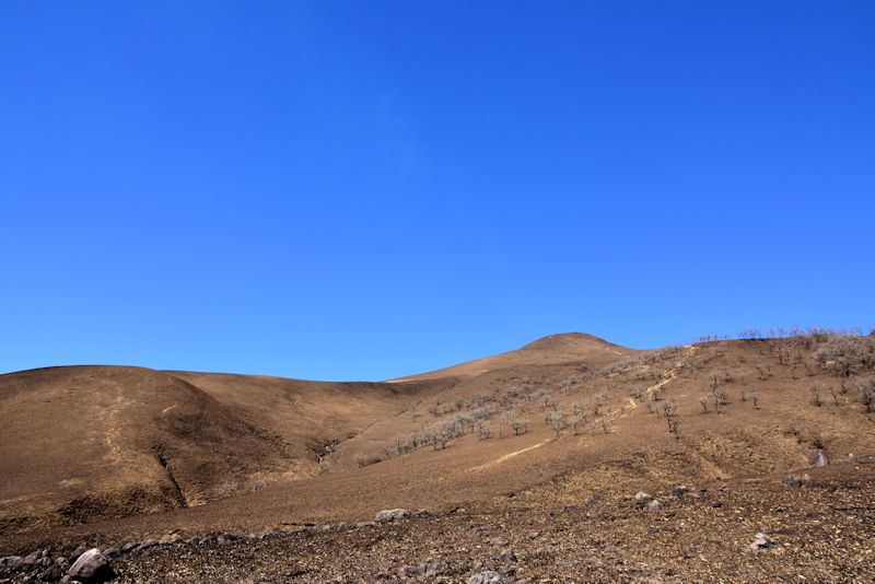 視界は足下だけだけど、強風にのってくる焼けた枯れ草の匂いと灰が目に入り痛い。とりあえず樹林帯に入れば大丈夫。明るくなってから見えた黒灰原は昨年の虎刈り状態とは一変、綺麗に真っ黒に焼けてました。