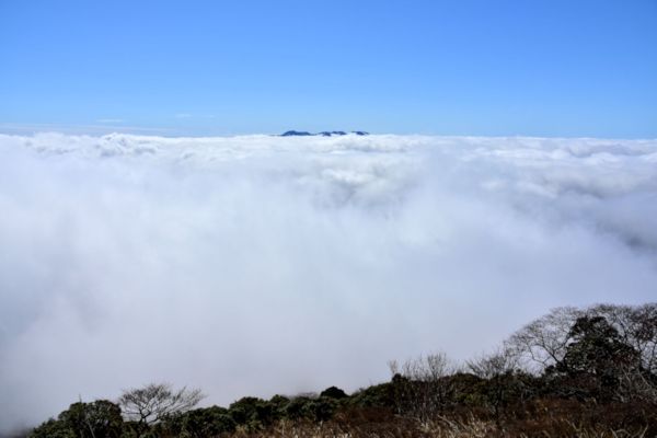 けど陽が差すおかげで大汗である。マタエに着くと雲海の上にくじゅう連山や祖母山系も浮かんでいて山頂からの景色が楽しみやん、と思って西峰に登り始めるとガスが湧く湧く、あっという間に真っ白の景色へ逆戻り・・・