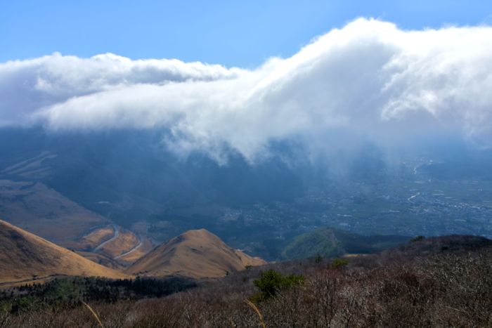 いつもの道で東登山口経由で帰宅しながら由布岳を見上げるとがっつりガスの景色だけどあの上が晴れてるなんて想像できんよなぁ、と思いつつ眺めてました。